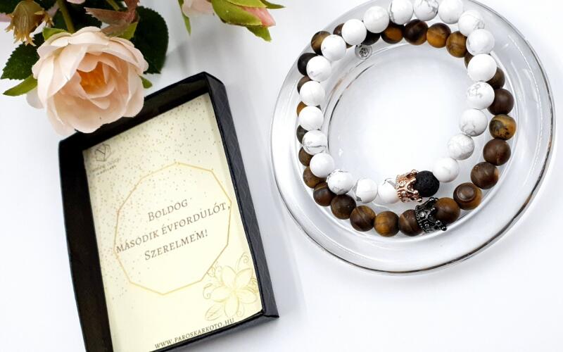 Teljesen egyedi, szerelmi ásványkarkötőpár Luxury korona medálokkal, és egy idézetes díszdobozzal. A női karkötő márványos howlit ásványból készült, és egy rosegold szín luxury korona medál díszíti, a férfi karkötő pedig tigrisszem ásványokból készült, és egy antracit fekete luxury korona medál díszíti. Az ajándékszett része a karkötőpár (2db) , az idézet
