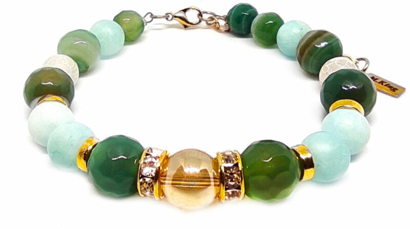 Figyelem! Nem szakad, nem nyúlik! Tartós ékszer. Kérheted csat nélküli rugalmas gumidamilra is. Amennyiben rugalmas damilra kéred, Megjegyzésbe írd be rendeléskor, hogy csat helyett rugalmas gumidamilt kérsz, és a csuklód körbemért méretét is írd meg. Az ékszer ásványai és tartozékai: – 10 mm-es arany angyal aura gyöngy – 10 és 8 mm-es fazettált zöld achát ásv