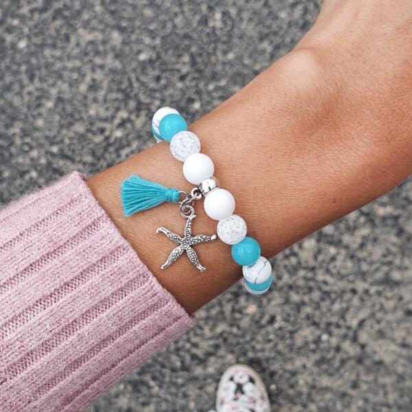 Álomszép "Türkiz álom" tengericsillagos ásványkarkötő, bojt medállal. Az ásványkarkötő, a következő ásványokat tartalmazza:*holdkő*hófe hér tejkvarc*kék kvarc*howlit*hegyikristál y