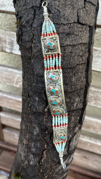 Tibeti ezüst kézzel készített karkötő lapis lazuli, türkiz és korall kövekkel. Tibeti ezüst és más fémek ötvözetéből készül gyönyörű kézzel készített egyedi karkötő.