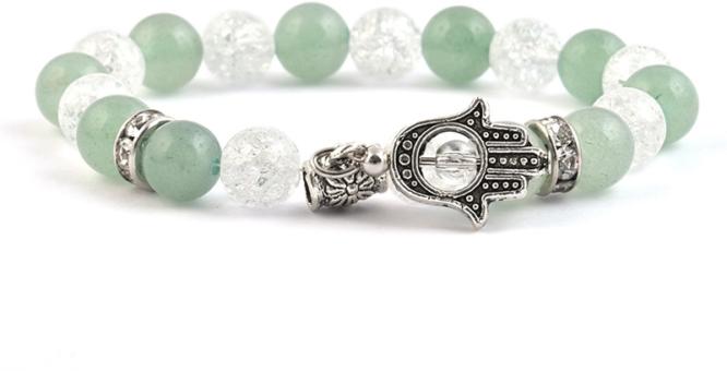 A karkötő 8 mm-es aventurin, 4 mm-es hegyikristály és 8 mm-es extra minőségű repesztett hegyikristályból áll. A díszítőelemek : 8 mm-es strasszgyűrű és Fatima keze medál. A karkötő méretének meghatározása : a csuklód pontos méretéhez adj hozzá kb. 1,5 cm-t. KÉRLEK VÁLASSZ MÉRETET ! Az ásványok nem helyettesítik az orvosi diagnózist és kezelést. Az aventurin hat