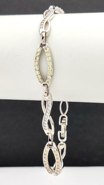 Ezüstszínű karkötő, melyet rózsaszín, halványzöld, aranysárga és fehér cirkónia kristályok tesznek csillogóvá és végtelen jelet mintázó szemek díszítenek. A kristályok karmos foglalatban helyezkednek el. A kristályok a karkötő teljes hosszát díszítik. Időtálló ékszer, nem feketedik, nem színezi a bőrt. Mindennapi használatra is tökéletes választás. Antialler
