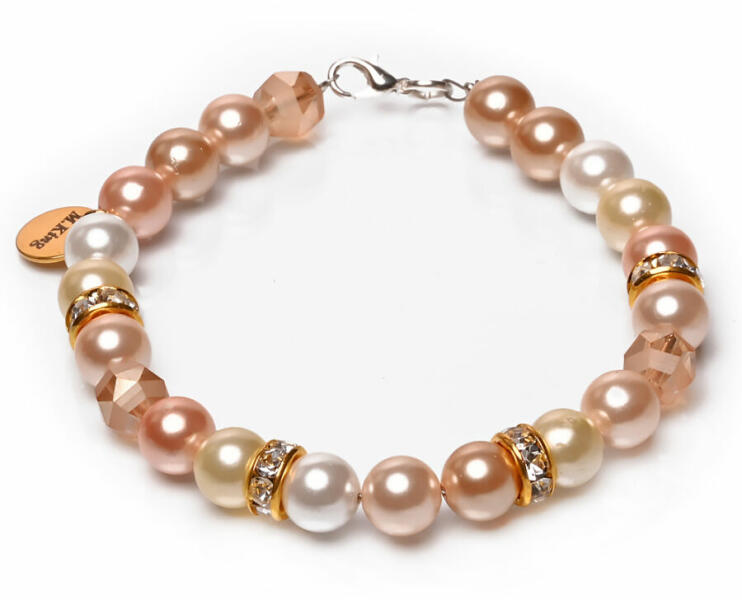 Figyelem! Nem szakad, nem nyúlik! Tartós ékszer. Az ékszer ásványai és tartozékai: – 8 mm-es fehér, arany és mályva színű mesterséges gyöngyök – 8 mm-es fazettált arany üveg gyöngy – Arany színű strasszos díszek – M. King márkajelzésű nemesacél logóbiléta a csatnál – Záródása: delfinkapocs és 5 cm hosszabbító lánc – Technika: extra erős acélsod