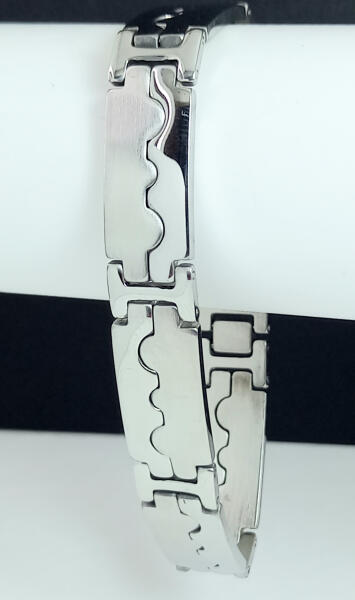 Ezüstszínű nemesacél (316L) hullám mintás karkötő, mattosított dísz résszel. Tartós, minőségi ékszer, nem feketedik, nem kopik. Mindennapi viseletnek is tökéletes választás. Antiallergén ékszer. Hosszúság: 21 cm. Szélesség: 12 mm. Igény esetén rövidíthető, melyet ingyenesen elvégzünk. Kérjük a méretet rendeléskor a megjegyzés rovatban feltüntetni. A nemesacél