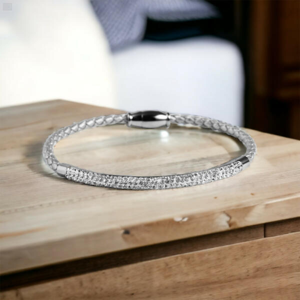 Ez a csodálatos fonott ezüst színű bőr karkötő egy igazán elegáns és stílusos kiegészítő minden nő számára. Ez a karkötő igazán különlegessé teszi a megjelenést és a strasszok habzsolják a figyelmet minden alkalommal. A karkötő fonott mintázata egyedi és kifinomult, ami egyedülálló vonzerőt kölcsönöz. Az ezüst színű bőr alapú fonás luxus és exkluzív han
