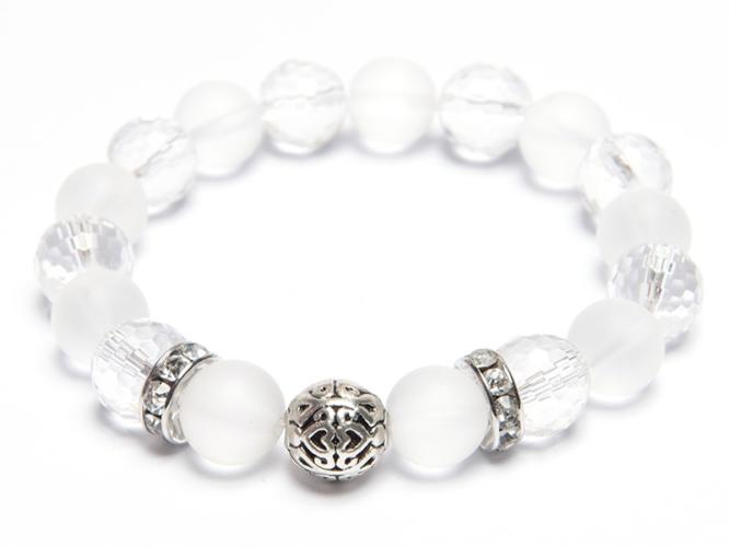 A karkötő 10 mm-es A minőségű matt és 10 mm-es A minőségű fazettált hegyikristály ásványgömbökből készült gyöngyfűzőgumira fűzve. A díszítőelemek : 1 db 10 mm-es antiallergén szívmintás díszgolyó és 2 db 10 mm-es antiallergén strasszgyűrű. A karkötő méretének meghatározása : a csuklód méretéhez adj hozzá 2-2,5 cm-t. Az ásványok nem helyettesítik az or