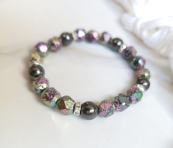 Őszi hangulatú ásványkarkötő. Egyedi tervezésű szivárványos lávakő, és hematit ásványokból készült, ezüst díszítéssel.