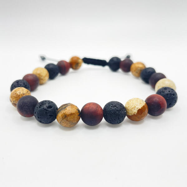 Egyedi gondosan, szeretettel, kézzel készített karkötő tigrisszem, lávakő és képjáspis ásványból (ásvány karkötő), tartós zsinórra fűzve, mely nem szakad, nem szöszölődik, víz is érheti. Az ásvány karkötők régóta használatosak az emberek által, mivel az egyes kőfajták energetikai tulajdonságai hozzájárulnak az egészségügyi állapot javulásához. Egy ilyen