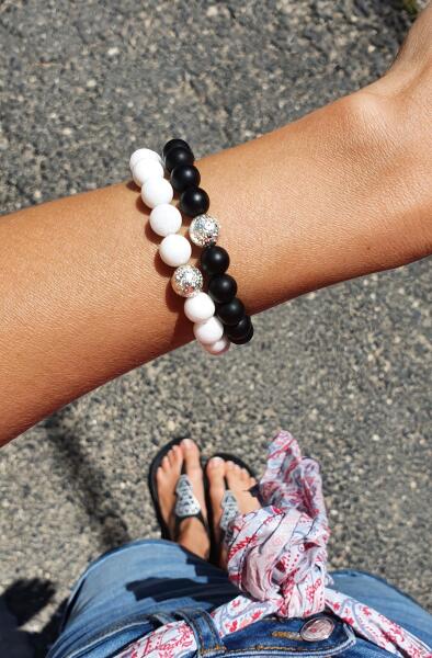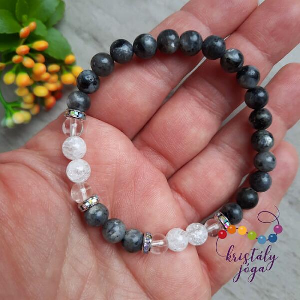 Gyönyörű egyedi szerelmi karkötőpár. A női karkötő hófehér tejkvarc ásványból készült, egy szem ezüst lávakővel, míg a férfi karkötő matt fekete ónixból és egy szem ezüst lávakő díszíti, mely a párok között az összetartozást jelképezi. Ez a karkötőket az összetartozást és szerelmet szimbolizálja két ember között. Az ár egy pár (2db) karkötőre vonat