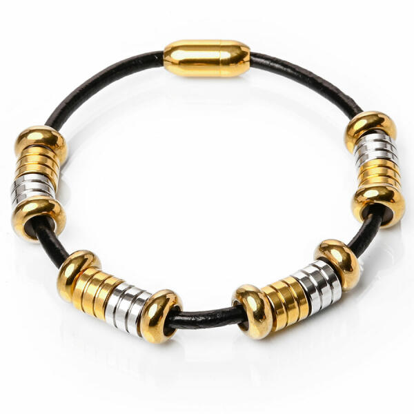 Mágnes záras bőr karkötő nemesacél díszekkel. Karkötő bőr, méretét válaszd ki a listából vagy írd be megjegyzésbe. A Maria King Bőr és nemesacél karkötő egy igazán elegáns és stílusos kiegészítő. A bőr lánc erős bőrből készült, ami nagyon kellemes érintést biztosít a viselése során. A nemesacélból készült részek pedig egyedi dizájnt adnak a terméknek