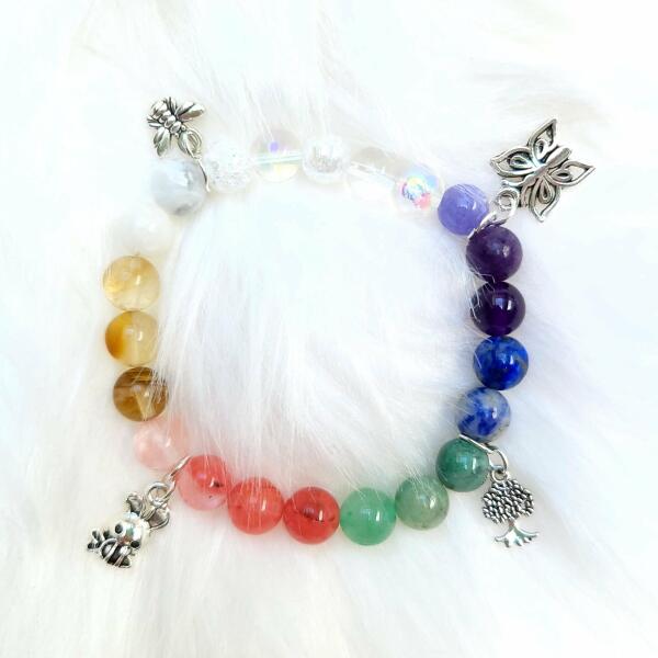 Tavaszi virágzás charm kristálykarkötő. Ez a gyönyörű karkötő 14 fajta ásványból készült és 4 charm van rajta, így az egyik legkülönlegesebb ásványkarkötőnk. A karkötőn lévő ásványok, az alábbiák: hegyikristály, aurakvarc, ametiszt, lilakvarc, lazurit, szodalit, indiachát, aventurin, cseresznyevirág-jáspis, rózsakvarc, rózsaopál, tejkvarc, howlit, füstkvarcLi