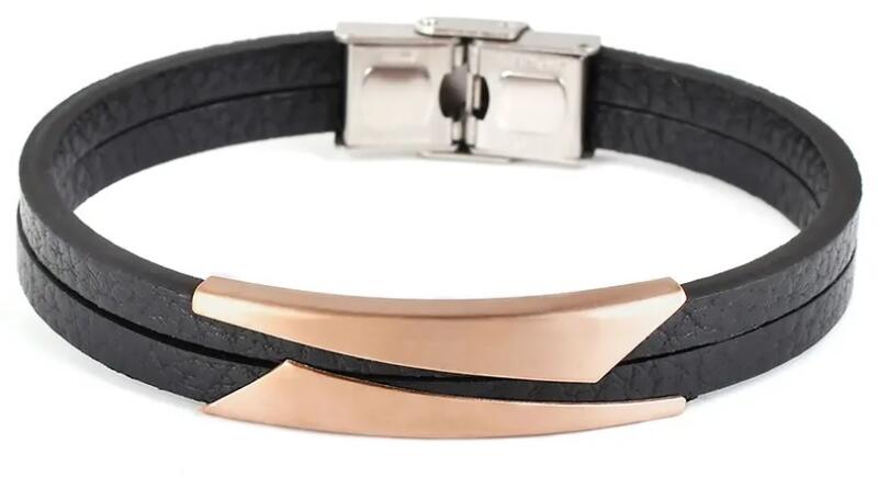 Domingo Férfi Karkötő Különleges Domingo karkötő uraknak verhetetlen áron. Ezzel a karkötővel szépen kiegészítheti öltözékét. Az ékszer nem tartalmaz sem nikkelt, sem ólmot, sem kadmiumot, ezért érzékeny bőrű emberek is viselhetik. Tulajdonságok: A karkötő hossza: 20cm Anyaga: Öko bőr/Nemesacél Szín: Fekete/RózsaArany
