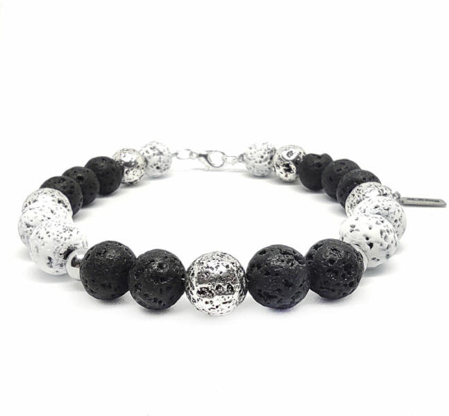 Figyelem! Nem szakad, nem nyúlik! Tartós ékszer. Kérheted csat nélküli rugalmas gumidamilra is. Amennyiben rugalmas damilra kéred, Megjegyzésbe írd be rendeléskor, hogy csat helyett rugalmas gumidamilt kérsz, és a csuklód körbemért méretét is írd meg. Az ékszer ásványai és tartozékai: – 8 mm-es matt fehér és fekete lávakő ásványok – 8 mm-es Hematit ezüst szín