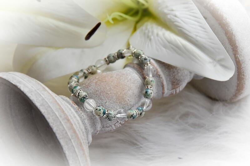 Az amazonit golyók gumira vannak felfűzve. Amit az amazonitról érdemes tudnod: Az amazonit nagyrészt átlátszatlan kő, esetleg halvány tejfehér felhőkkel a világoszöldtől a kékes-zöldön keresztül a sötét zöldig/kékig. Ezt a követ mostanában méltánytalanul mellőzik, pedig sokféle hasznos gyógyhatással bír. Lelki gyógyhatás: Az amazonit nyugtató hatással bír az ide