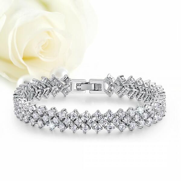 Luxus kivitelezésű, menyasszonyi karkötő, melyet három sorban kirakott briliáns csiszolású cirkónia kristályok díszítenek. Valódi fehérarany bevonattal készült bőrbarát fémötvözetből. Kétféle hosszúságban kapható: 17cm és 19cm Elegáns, csillogó menyasszonyi karkötő, melyet hófehér menyasszonyi ruhához ajánlunk hasonló stílusú kiegészítőkkel. Elegáns sítl