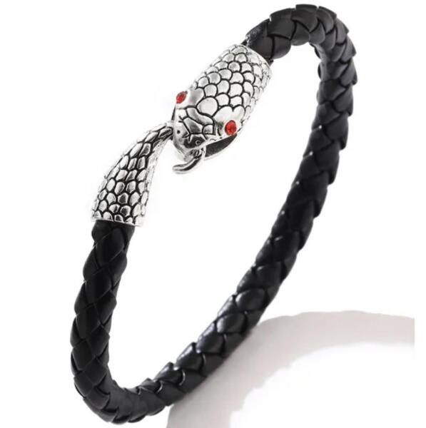 Schlange karkötő A kígyó motívummal díszített feltűnő karkötő a hatalom, erő és bátorság tökéletes szimbóluma. Kiváló minőségű fekete fonott bőrből készült, a karkötő a hagyományos kézműves feldolgozást modern dizájnnal ötvözi. A részletesen kidolgozott pikkelyekkel és piros szemekkel rendelkező kígyó drámai megjelenést kölcsönöz a karkötőnek, amely