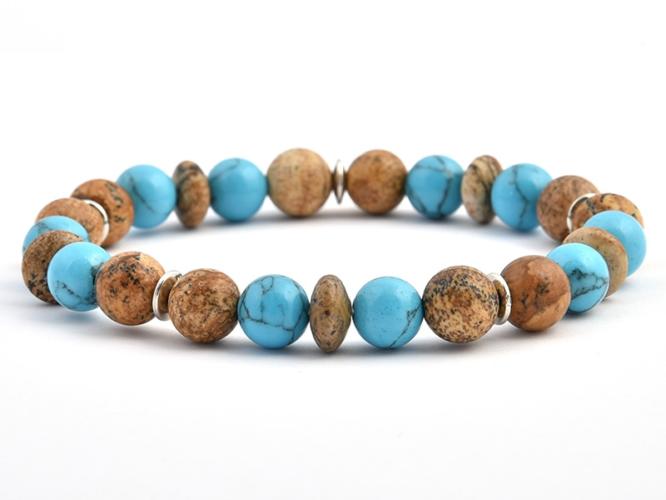 A tájképjáspis és a türkinit 8 mm-es gömbjeiből és a 8x5 mm-es tájképjáspis korongból készített és duplasorosan gumira fűzött karkötő. A fém alkatrész 5x1 mm-es ezüst színű, fém tárcsa. Az ásványok nem helyettesítik az orvosi diagnózist és kezelést. A tájképjáspis hatása : a tájképjáspis erősíti az immunrendszert, tisztítja a veséket. Elősegíti a mély