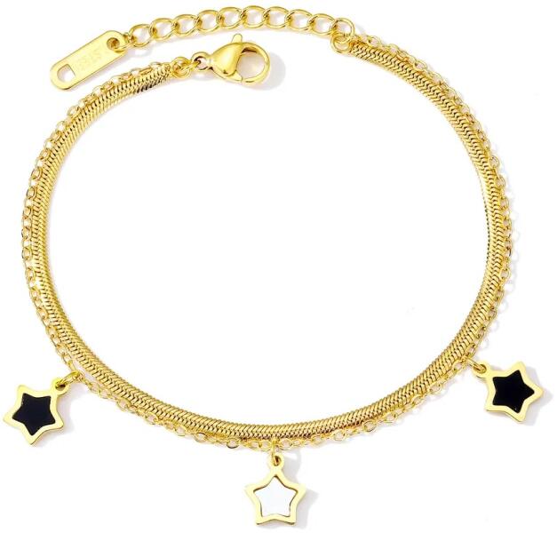 Hazel Karkötő Szépséges, divatos Hazel karkötő verhetetlen áron. A dupla soros karkötőt csillagocska medálok díszítik, Önt is biztosan elbűvöli. Az ékszer nem tartalmaz nikkelt, ezért érzékeny bőrű emberek is viselhetik. Tulajdonságok: A karkötő hossza: 14cm + 4cm Díszítése: Csillagocska medálok Anyaga: Nemesacél Szín: Arany