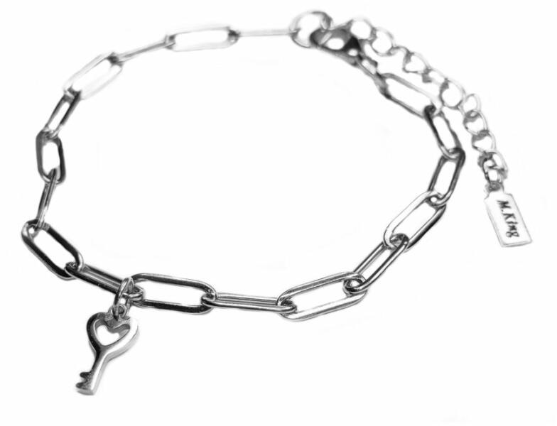 Szív Kulcs charmos karkötő, ezüst színű. Paraméterek: Charm mérete 1,2 cm. Anyaga nemesacél, karkötő anyaga rozsdamentes acél. Karkötő mérete 17+5 cm. (Ha ettől eltérő méretet szeretnél, rendeléskor a MEGJEGYZÉSBE írd be. )