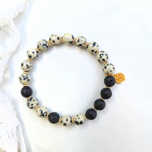 Yvonne Design egyedi tervezésű csodaszép ásványkarkötő, mely fekete lávakő és dalmatajáspis ásványokból készült arany csillogó díszekkel.