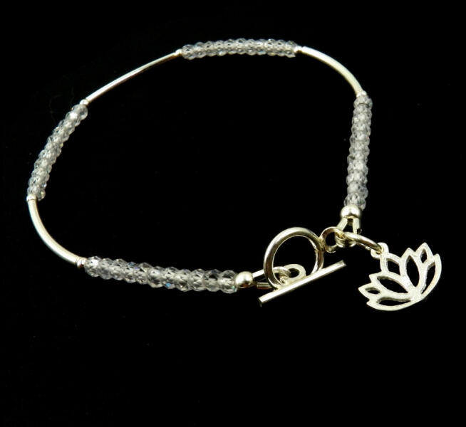 Természetes fazettált cirkóni (cirkon, hiacint) gyöngy drágakőből készült ezüst karkötő, egykezes "T" kapoccsal, lótuszvirág medállal. Hossza fix, de kérésre egyedi hosszúságban is készítem. Bővebb információ "ADATOK PARAMÉTEREK" fül alatt. A Cirkon vélt gyógyhatása