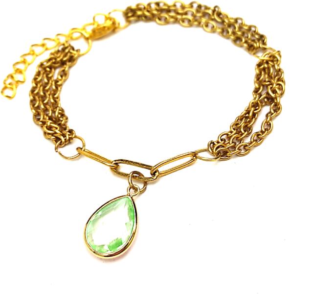 Három soros divat karkötő zöld kristály csepp charmmal, arany színű. Paraméterek: Charm mérete 1,8 cm. Anyaga fémötvözet és kristály, karkötő anyaga rozsdamentes acél. Karkötő mérete 17+5 cm. (Ha ettől eltérő méretet szeretnél, rendeléskor a MEGJEGYZÉSBE írd be. )