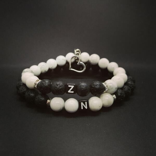 Gyönyörű egyedi szerelmi karkötőpár lávakő és márványos howlit ásványból. A karkötőkön egy-egy betű található a nevetek kezdőbetűi, a nőin a férfi név kezdőbetűje, a férfi karkötőn a női név kezdőbetűjével, illetve a női karkötőt egy szívecske medál díszíti. Az ár egy pár (2db) karkötőre vonatkozik.
