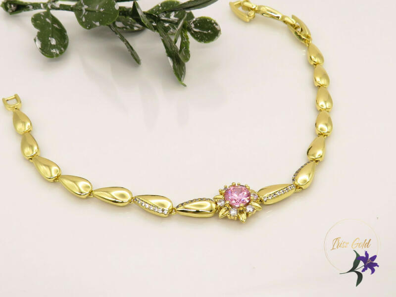 Goldfilled meseszép karkötő cseppformájú szemekkel középen nagy rózsaszín virágalakú cirkóniakő Szin: 14K Méret: 17cm + 2cm kivehető szem /9mm A forgalmazott divatékszerek alapanyaga nikkel és ólommentes ezért többnyire nem okoznak allergiás tüneteket, nyugodtan hordhatják fémérzékeny emberek is. Általában nem színezik a bőrt és más divatékszerekhez képest nagysá
