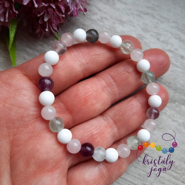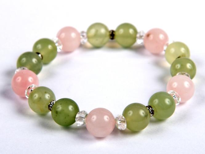 A 6 mm-es rózsakvarc, jáde és roppantott hegyikristály gyöngyök gumira vannak felfűzve. Amit a jádéről érdemes tudnod: A Jáde egy gyűjtőcsoportja a kövek egy fajtájának. A zöld kínai jáde az egyik legnépszerűbb és leggyakoribb a csoporton belül, amelyik hazájában Kínában nemzeti kőnek számít. Lelki gyógyhatás: A zöld szín általános nyugtató hatással bír. Iga