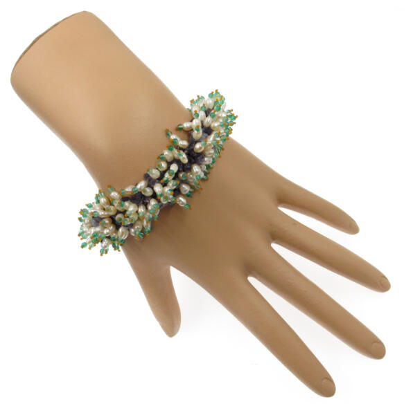 Tenyésztett gyöngy karkötő szabálytalan természetes iolittal és apró zöld ónix gyöngyökkel. A karkötő csúszó zárral állítható, zsinór alapra van rádolgozva, hossza kb. 17-19 centi közti csuklóra megfelelő. Az iolit vélt hatása.