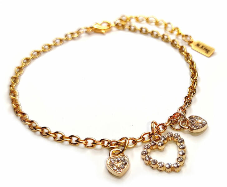 Kristály szív és lakat charmos arany színű karkötő. Paraméterek: Charm mérete 1,3 és 0,8 cm. Anyaga fémötvözet és kristály, karkötő anyaga rozsdamentes acél. Karkötő mérete 17+5 cm. (Ha ettől eltérő méretet szeretnél, rendeléskor a MEGJEGYZÉSBE írd be. )
