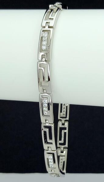 Ezüstszínű, áttört görög mintával díszített karkötő, melyet fehér cirkónia kristályok tesznek csillogóvá. A kristályok karmos foglalatban helyezkednek el, a karkötő teljes hosszát díszítik. Időtálló ékszer, nem feketedik víz hatására sem. Mindennapi használatra is tökéletes választás. Antiallergén ékszer. Karkötő szélessége: 6 mm. Az antiallergén ékszerek