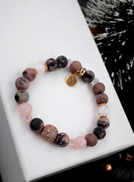 8 mm-es tejkvarc és rózsakvarc ásvány gyöngyökből fűzött gumis karkötő. Az ékszer dísze egy kristályokkal kirakott gömb és több csillogó gyűrű. Amit a rózsakvarcról érdemes tudnod: A festetlen rózsakvarc az egész világos, szinte áttetszőtől, a ködös középrózsaszínig terjed. Az egyik legnépszerűbb kövek egyike, amely szépséges küllemének és erős gyógyhat