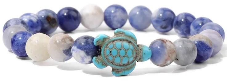 Tortuga Karkötő Modern Tortuga karkötő verhetetlen áron. Kialakításával Önt is biztosan elbűvöli, szépen kiegészíti öltözékét. Az ékszer nem tartalmaz nikkelt, ezért érzékeny bőrű emberek is viselhetik. Tulajdonságok: A karkötő mérete: gumis Szín: Kék/Fehér Anyaga: Gyöngygolyócskák A golyócskák mérete: 0,8cm Díszítése: Teknős medál