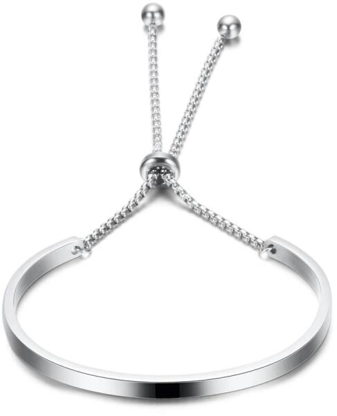 3.5 mm széles, a merev rész belső átmérője 6 cm karkötő könnyedén méretre állítható a csúszózárnak köszönhetően nemesacél karlánc, ezüst fazonban anti allergén, nem kopik, magasfényű, tartós ékszer az idő múlásával nem veszít fényéből