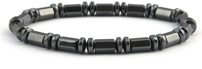 Hematit 8x4-es rövid cső és 6x3,5-es tárcsa felhasználásával készült gumis, férfi karkötő. A hematit ásvány nagy mennyiségben fordul elő Oroszországban, Norvégiában és Magyarországon a Velencei hegységben. Színe csiszolatlanul vörös és sötét szürke. Magas vas-oxid tartalma miatt az ipar használja, de ékszereket és faragványokat is készítenek belőle. Gyógyhatás