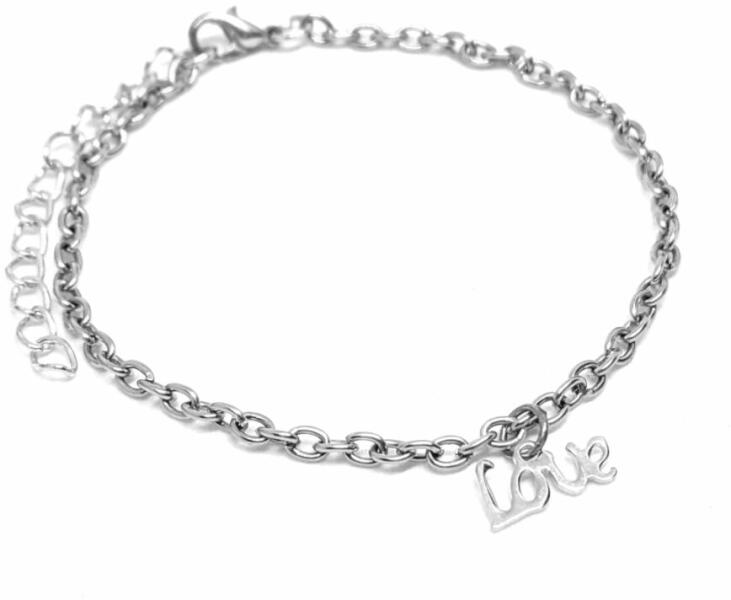 Nemesac l Love feliratos karkötő. Letisztult karkötőn kifinomult Love felirat charmmal. Egyszerű, mégis különleges ékszer. Paraméte rek: Charm mérete kb. 1,2 cm. Anyaga nemesacél. Karkötő mérete 17+5 cm. (Ha ettől eltérő méretet szeretnél, rendeléskor a MEGJEGYZÉSBE írd be. )