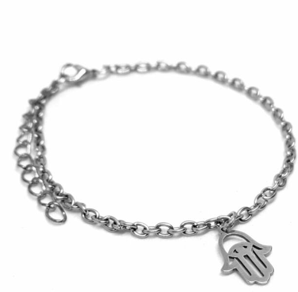Nemesac l Fatima keze karkötő. Letisztult karkötőn kifinomult Fatima keze charmmal. Egyszerű, mégis különleges ékszer. Paraméte rek: Charm mérete kb. 1,4 cm. Anyaga nemesacél. Karkötő mérete 17+5 cm. (Ha ettől eltérő méretet szeretnél, rendeléskor a MEGJEGYZÉSBE írd be. )