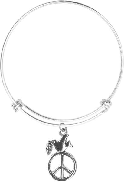 Átmérője 6 cm. Valamelyest rugalmasan felvehető, nem nyitható, tehát a kézfej is átbújik a karperecen. Kb. 17-18 cm-es körméretű csuklóig ajánlott. Békegalambos medál ezüst színű karperecen. Paraméterek:Medál / mérete kb. 2 cm. Medál anyaga fém ötvözet. Karperec anyaga rozsdamentes acél.