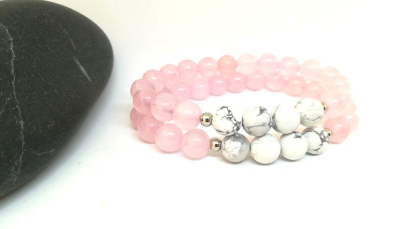 Gyönyörű rózsakvarc és howlit ásványokból készített karkötőpár Anya és Lánya részére, mely a szeretetet és az össze tartozást jelképezi az Édesanya és lánya között. A termék ára egy pár (2 db) karkötőre vonatkozik. Ehhez a termékhez ajándék díszdoboz jár.