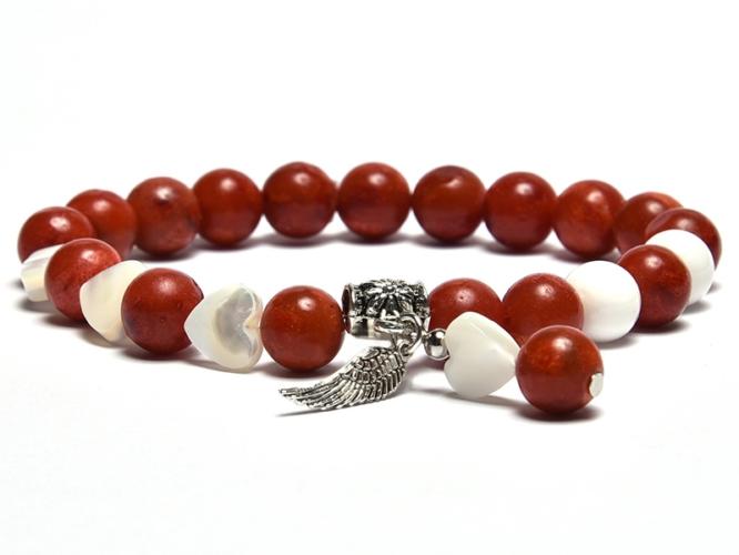A karkötő 8 mm-es korall és hófehér kagylóhéj gömbökből, valamint 8 mm-es gyöngyház szív felhasználásával készült, gyöngyfűző gumira fűzve. A díszítőelem antiallergén 13 mm-es angyalszárny. A karkötő méretének meghatározása : a csuklód méretéhez adj hozzá 1,5 cm-t. Az ásványok nem helyettesítik az orvosi diagnózist és kezelést. A korall ékszer ne érintk