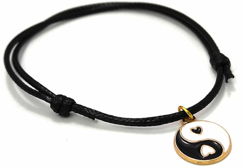 Fekete zsinórszövet karkötő fekete-fehér jin-jang charmmal. Paraméterek:. Charm mérete kb. 1,5 cm. Charm anyaga fémötvözet. Karkötő anyaga textil.
