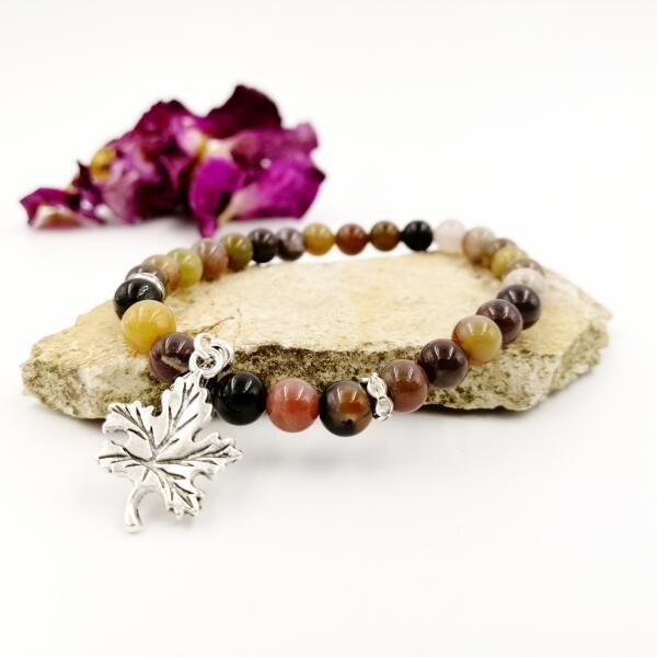 Egyedi tervezésű mintás indiachát ásványokból készült karkötő levél medállal díszítve.