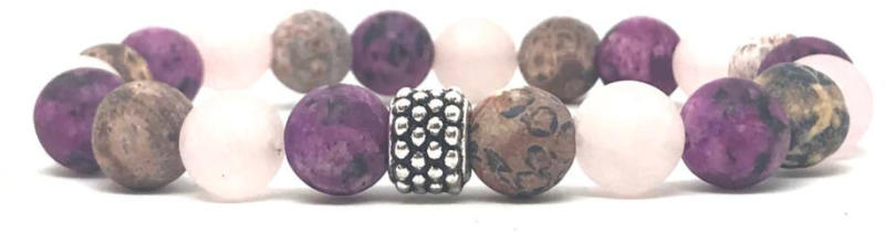 Egyedi ásvány karkötő A 8mm-e Rózsakvarc, Leopárd Jáspis és festett kvarc ásvány golyókból készült egyedi ásvány karkötő speciális gumis damilra van fűzve, fém köztes díszítéssel. Amit a Rózsakvarc ásványról tudni kell: A festetlen rózsakvarc az egész világos, szinte áttetszőtől, a ködös középrózsaszínig terjed. Az egyik legnépszerűbb kövek egyike, amely