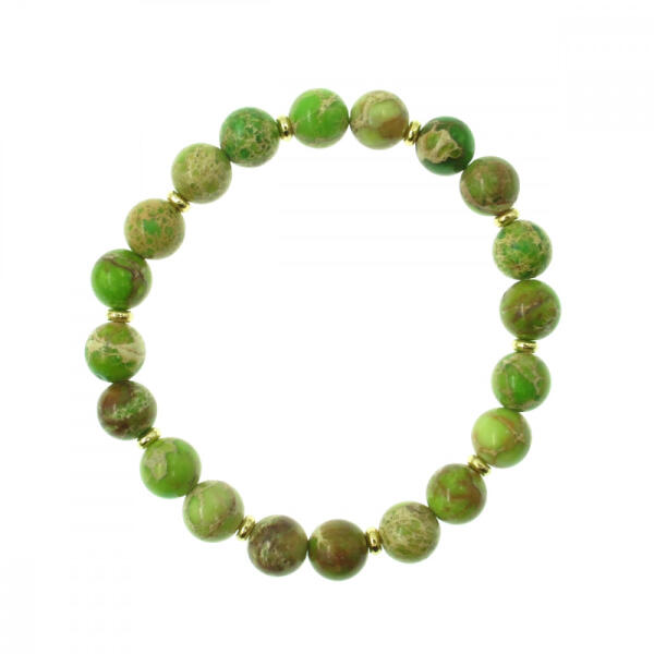 Sárgás-zöld regalit imperiál jáspis gumis karkötő. A gyöngyök mérete 8mm, a karkötő hossza választható A karkötőből több darab elérhető, a fotó a raktáron lévő valamely ékszerről készült, így mintázata némileg eltérő. A jáspis vélt hatása