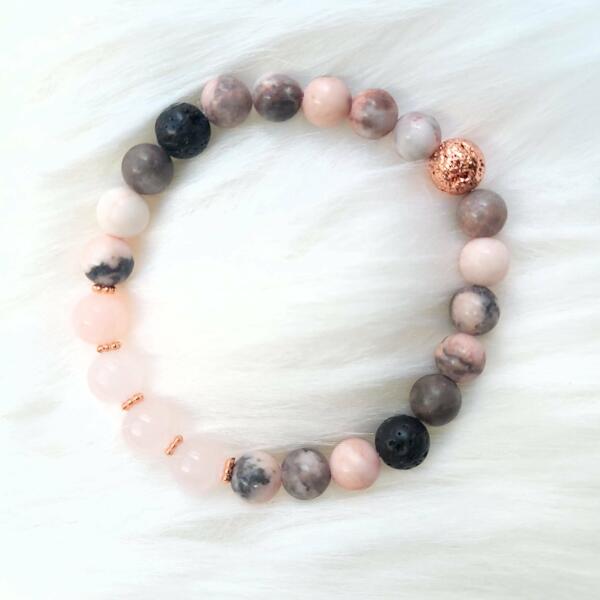 Yvonne Design egyedi tervezésű csodaszép ásványkarkötő, mely rózsakvarc, cseresznyevirágjáspis, és lávakő ásványokból készült rosegold csillogó díszekkel.