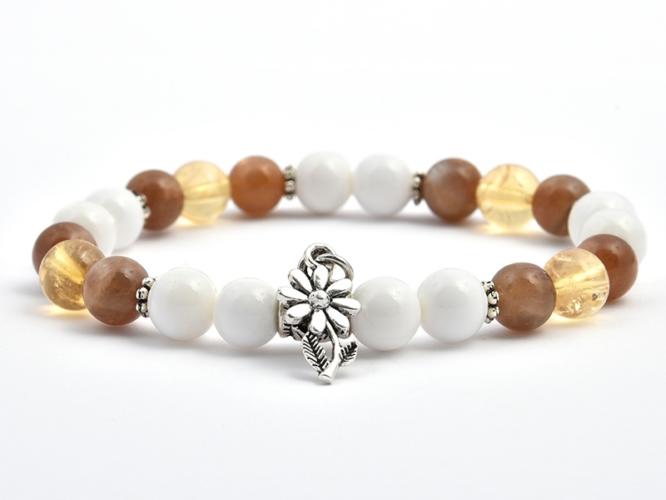 A napkő, a citrin és a hófehér kagylóhéj 8 mm-es gömbjeiből készített gumis karkötő. A díszítő elemek : ezüst színű fűzhető virág és 10x19 mm-es virág medál. Az ásványok nem helyettesítik az orvosi diagnózist és kezelést. A napkő hatása : a napkő a hagyomány szerint a jóakaratú istenekhez és a jó szerencséhez kötődik. Felderíti a komor hangulatot. Oldja a