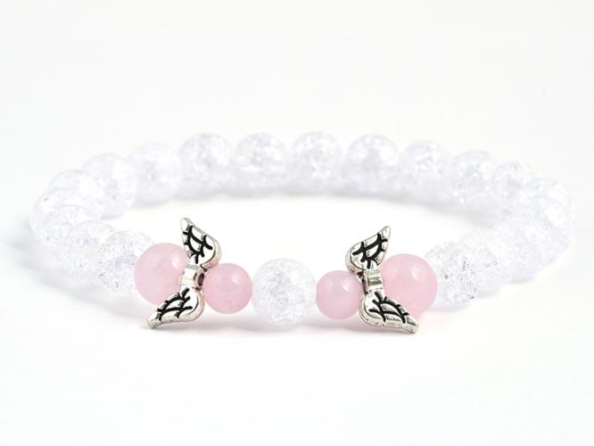 A csillogó AA minőségű 8 mm-es repesztett hegyikristály, a rózsakvarc 8 mm-es és a rózsakvarc 6 mm-es ásványgömbjeiből készített gumis karkötő. A felhasznált fém angyalszárnyat antiallergén bevonattal látták el. A karkötő méretének meghatározása : a csuklód pontos méretéhez adj hozzá 1,5 cm-t. KÉRLEK VÁLASSZ MÉRETET ! Az ásványok nem helyettesítik az orvosi di