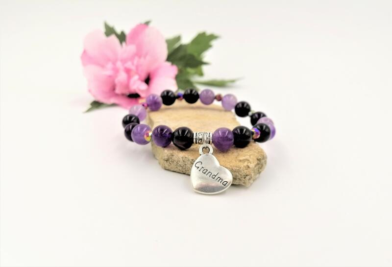 Gyönyörű egyedi tervezésű lila ametiszt ásványokból készült "Grandma" (Nagymama) feliratos karkötő.