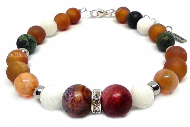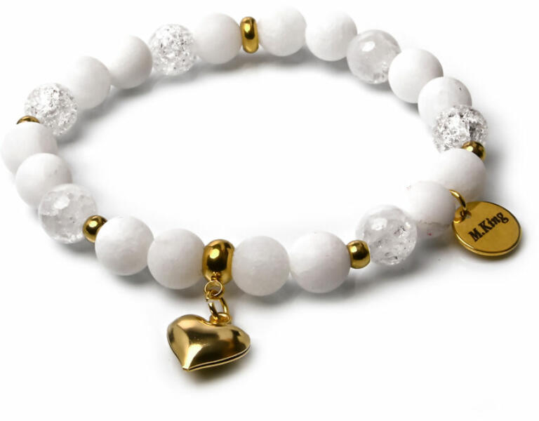 Figyelem! Nem szakad, nem nyúlik! Tartós ékszer. Kérheted csat nélküli rugalmas gumidamilra is. Amennyiben rugalmas damilra kéred, Megjegyzésbe írd be rendeléskor, hogy csat helyett rugalmas gumidamilt kérsz, és a csuklód körbemért méretét is írd meg. Az ékszer ásványai és tartozékai: – 8 mm-es fehér jade gyöngyök – 10 mm-es matt mookait jáspis gyöngyök – 8 m
